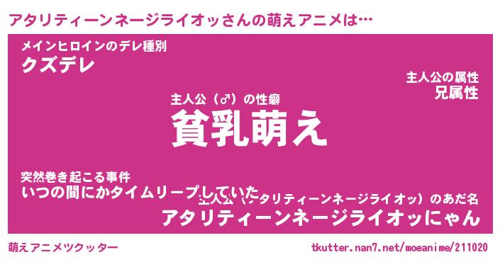 | 男性向けラノベタイトル風あだ名 | 『アタリティーンネージライオッの憂鬱』 |
