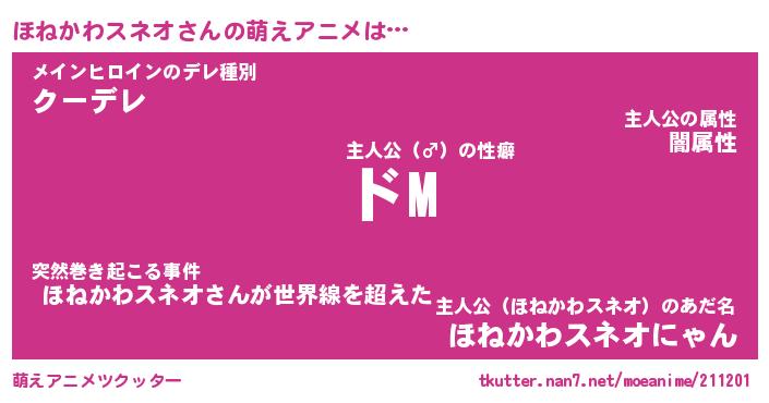 | 男性向けラノベタイトル風あだ名 | 『ほねかわスネオの憂鬱』 |