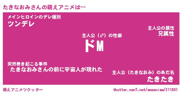 | 男性向けラノベタイトル風あだ名 | 『たきなおみの憂鬱』 |