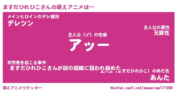 | 女子向けラノベタイトル風あだ名 | 『誰かこのますだひれひこを説明してください! ~契約から始まるウェディング~』 |