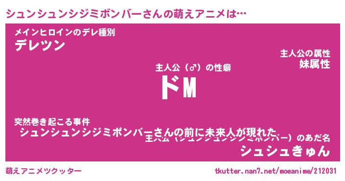 | 女子向けラノベタイトル風あだ名 | 『(仮)シュンシュンシジミボンバーのやんごとなき事情』 |