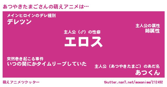 | 男性向けラノベタイトル風あだ名 | 『アツヤキタマゴアートオンライン』 |