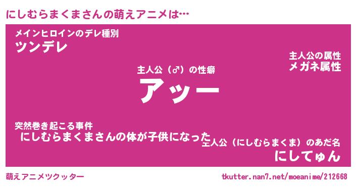 | 男性向けラノベタイトル風あだ名 | 『ニシムラマクマアートオンライン』 |