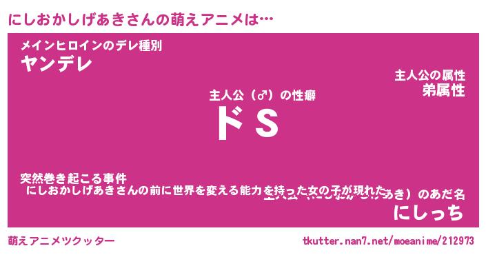 | 男性向けラノベタイトル風あだ名 | 『にしおかしげあきの憂鬱』 |