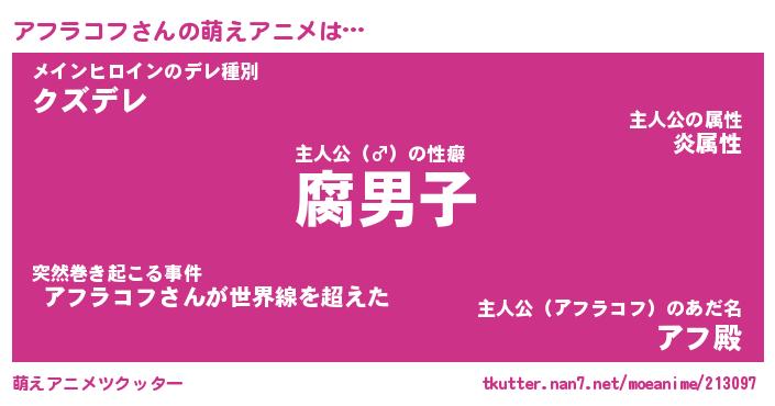 | 男性向けラノベタイトル風あだ名 | 『アフラコフアートオンライン』 |