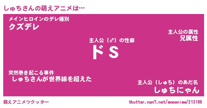 | 男性向けラノベタイトル風あだ名 | 『しゅちの憂鬱』 |