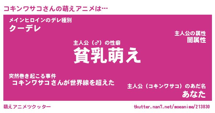 | 男性向けラノベタイトル風あだ名 | 『コキンワサコの憂鬱』 |