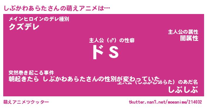 | 女子向けラノベタイトル風あだ名 | 『(仮)しぶかわあらたのやんごとなき事情』 |