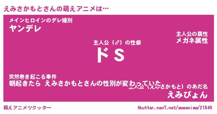 女子向けラノベタイトル風あだ名 | 『(仮)えみさかもとのやんごとなき事情』 |