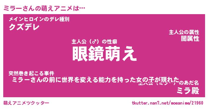 | 男性向けラノベタイトル風あだ名 | 『ミラーの憂鬱』 |