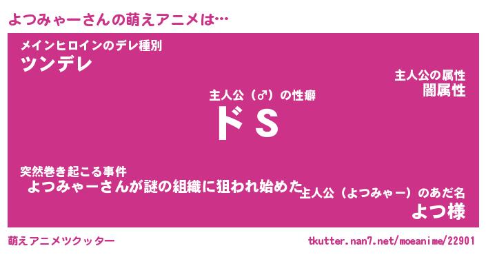 | 女子向けラノベタイトル風あだ名 | 『(仮)よつみゃーのやんごとなき事情』 |