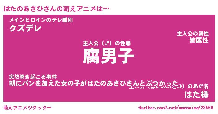 | 男性向けラノベタイトル風あだ名 | 『ハタノアサヒアートオンライン』 |