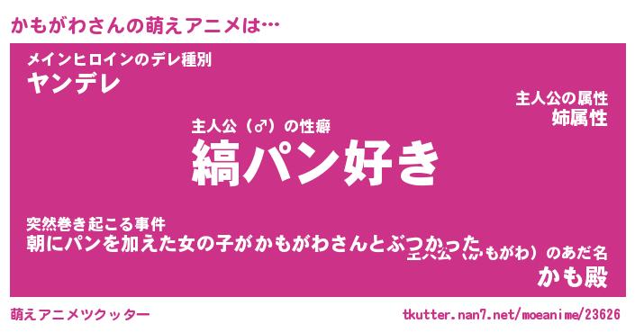 | 男性向けラノベタイトル風あだ名 | 『かもがわの憂鬱』 |