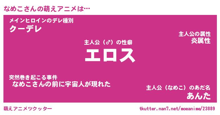 | 女子向けラノベタイトル風あだ名 | 『誰かこのなめこを説明してください! ~契約から始まるウェディング~』 |