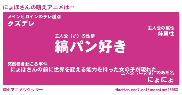 | 男性向けラノベタイトル風あだ名 | 『にょほの憂鬱』 |