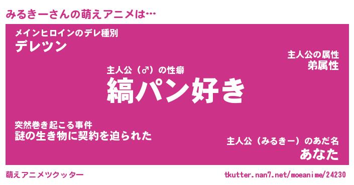 | 男性向けラノベタイトル風あだ名 | 『みるきーの憂鬱』 |