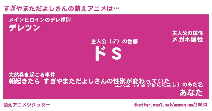 | 女子向けラノベタイトル風あだ名 | 『(仮)すぎやまただよしのやんごとなき事情』 |