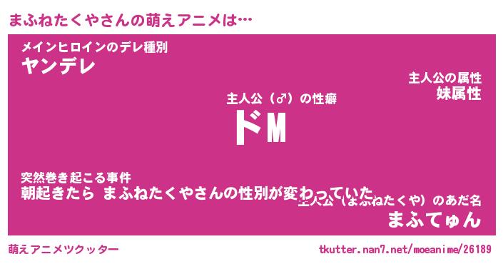 | 男性向けラノベタイトル風あだ名 | 『まふねたくやの憂鬱』 |