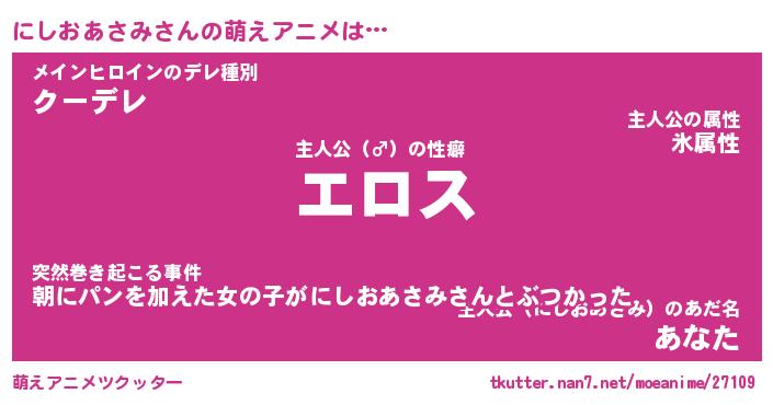 | 男性向けラノベタイトル風あだ名 | 『ニシオアサミアートオンライン』 |