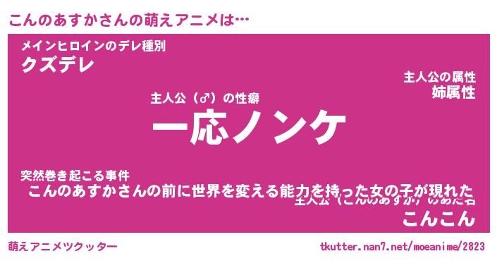 | 男性向けラノベタイトル風あだ名 | 『コンノアスカアートオンライン』 |