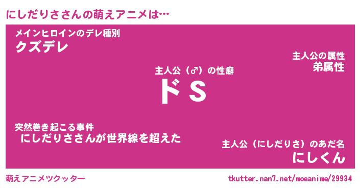 | 女子向けラノベタイトル風あだ名 | 『(仮)にしだりさのやんごとなき事情』 |