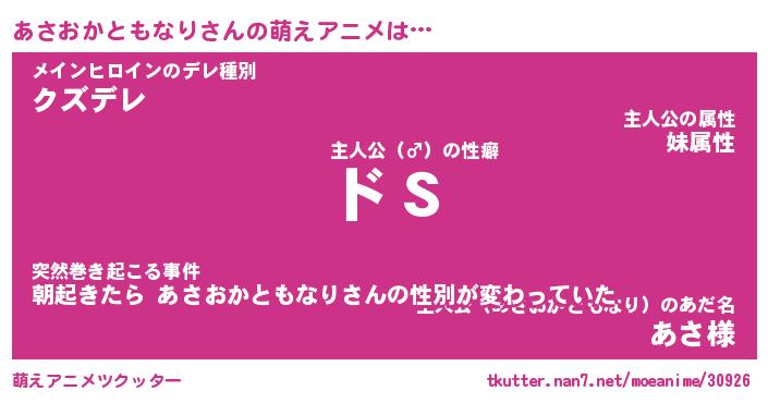 | 男性向けラノベタイトル風あだ名 | 『あさおかともなりの憂鬱』 |