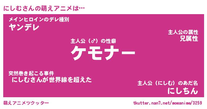 | 胡散臭い通販商品みたいなあだ名 | 『億万長者になれるブレスレット…その名も「にしむ」』 |