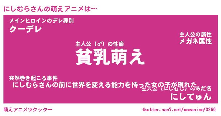 | 女子向けラノベタイトル風あだ名 | 『(仮)にしむらのやんごとなき事情』 |
