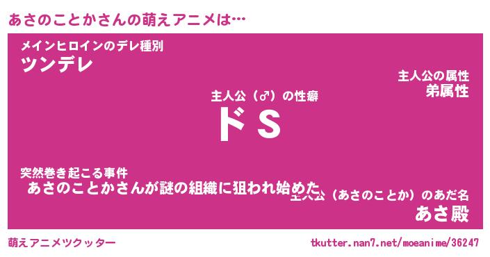 | 男性向けラノベタイトル風あだ名 | 『あさのことかの憂鬱』 |