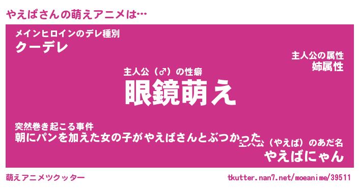 | 男性向けラノベタイトル風あだ名 | 『やえばの憂鬱』 |
