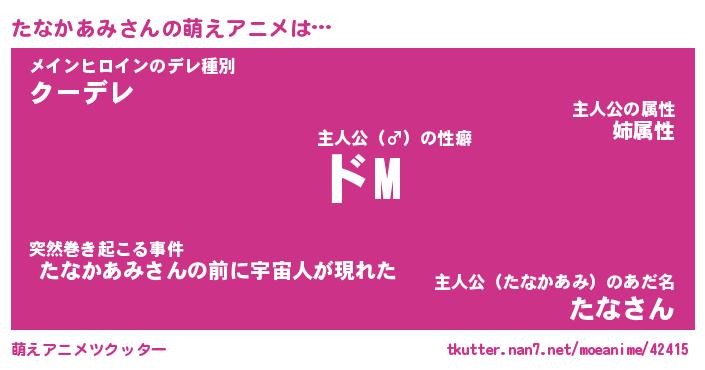 | 女子向けラノベタイトル風あだ名 | 『(仮)たなかあみのやんごとなき事情』 |