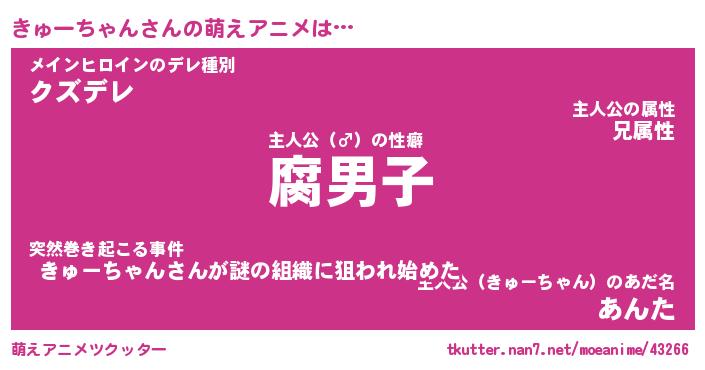 | 男性向けラノベタイトル風あだ名 | 『キューチャンアートオンライン』 |