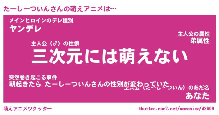 | 女子向けラノベタイトル風あだ名 | 『たーしーついん姫と円卓の騎士』 |