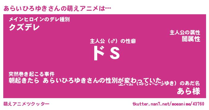 | 女子向けラノベタイトル風あだ名 | 『(仮)あらいひろゆきのやんごとなき事情』 |