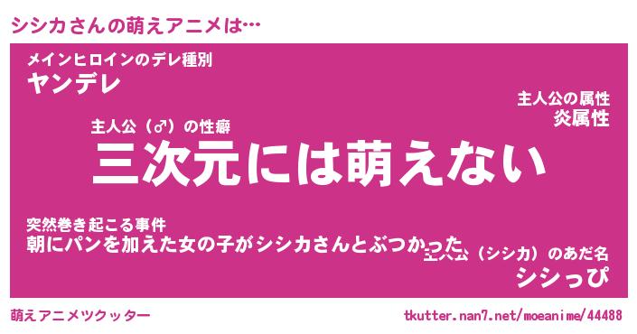 | ファンタジー風あだ名 | 『シシフェル』『エターナルシシカー』 |
