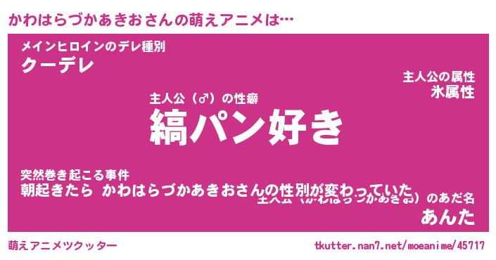 | 男性向けラノベタイトル風あだ名 | 『かわはらづかあきおの憂鬱』 |