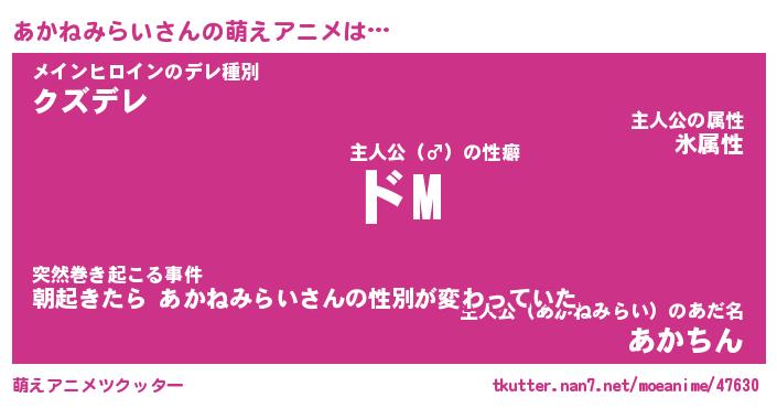 | 男性向けラノベタイトル風あだ名 | 『あかねみらいの憂鬱』 |