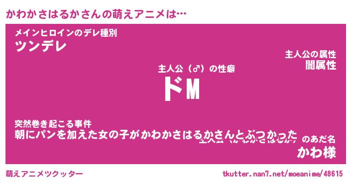 | 男性向けラノベタイトル風あだ名 | 『かわかさはるかの憂鬱』 |