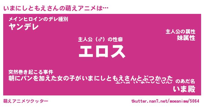 | 男性向けラノベタイトル風あだ名 | 『イマニシトモエアートオンライン』 |