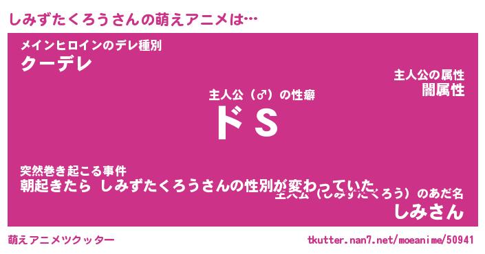 | 男性向けラノベタイトル風あだ名 | 『しみずたくろうの憂鬱』 |