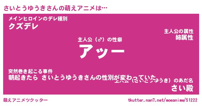 | 男性向けラノベタイトル風あだ名 | 『サイトウユウキアートオンライン』 |
