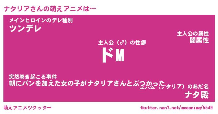 | 女子向けラノベタイトル風あだ名 | 『(仮)ナタリアのやんごとなき事情』 |