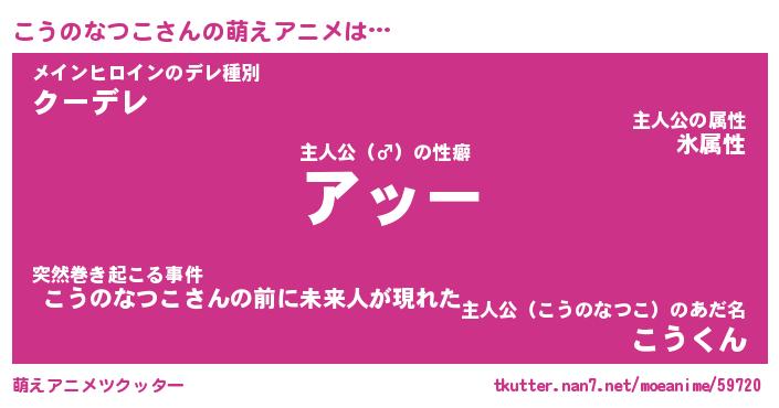 | 男性向けラノベタイトル風あだ名 | 『コウノナツコアートオンライン』 |