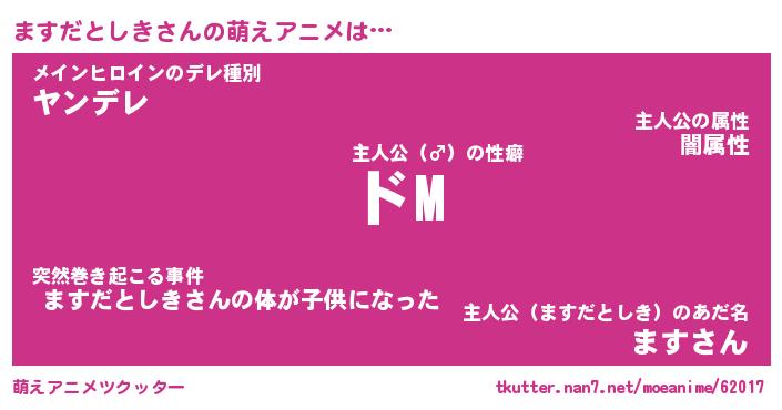 | 女子向けラノベタイトル風あだ名 | 『(仮)ますだとしきのやんごとなき事情』 |