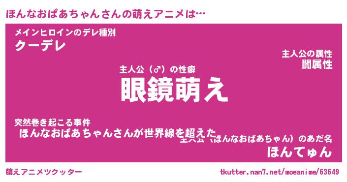 | 男性向けラノベタイトル風あだ名 | 『ほんなおばあちゃんの憂鬱』 |