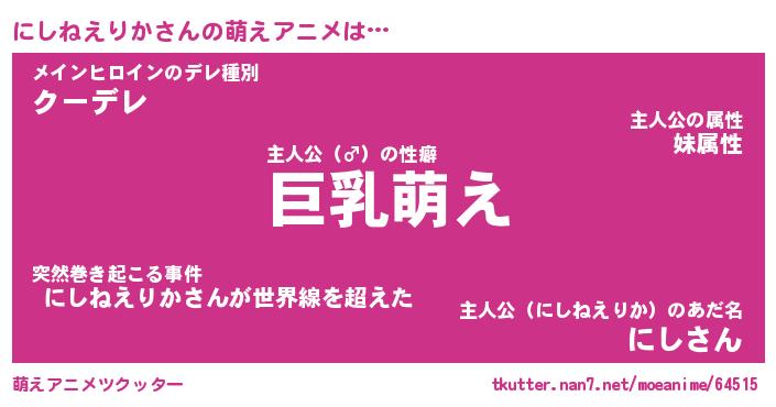 | 男性向けラノベタイトル風あだ名 | 『にしねえりかの憂鬱』 |