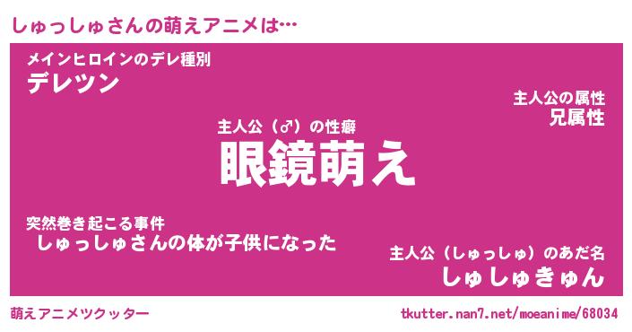 | 男性向けラノベタイトル風あだ名 | 『しゅっしゅの憂鬱』 |