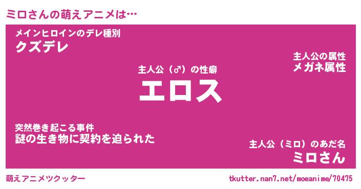 | 女子向けラノベタイトル風あだ名 | 『誰かこのミロを説明してください! ~契約から始まるウェディング~』 |