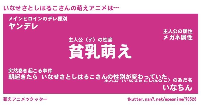 | 男性向けラノベタイトル風あだ名 | 『いなせさとしはるこの憂鬱』 |