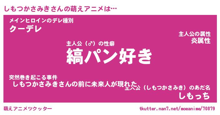 | 男性向けラノベタイトル風あだ名 | 『しもつかさみきの憂鬱』 |